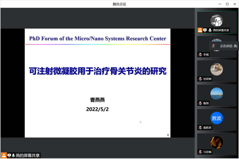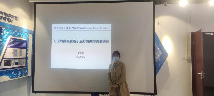 本次学术报告汇报人为曹燕燕博士,汇报的内容是可注射微凝胶用于治疗骨关节炎的研究。曹燕燕博士首先介绍了骨关节炎的发病特征,其治疗研究主要集中在关节内注射给药、局部基因治疗和基于干细胞的治疗等,并概述了目前治疗技术存在的关键问题,包括润滑减少、给药效率不高、药物滞留时间短、反复给药会严重削弱药物的疗效等。然后,结合前期水凝胶的研究,介绍了可注射微凝胶具有尺寸小、比表面积大、方便自组装的特性,其已广泛应用在化工、生物医药、组织工程等多个领域。针对骨关节炎治疗中存在的上述问题,曹博士围绕可注射微凝胶作为一种能够修复骨关节炎软骨的有效策略展开报告。参会的各位老师、员工就学术报告相关内容进行了热烈的讨论。