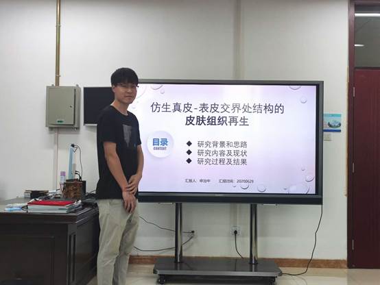 本次学术报告汇报人为申治中博士,内容为”模拟表皮真皮交界处结构的皮肤组织再生”。 申治中博士首先从组织工程的背景出发,介绍了组织工程的历史发展以及组织工程涵盖的要素。再具体到对皮肤再生发展现状和不足的介绍,引出自己课题的创新点,根据前人已有的类似研究,提出自己的研究思路,并介绍了自己的研究进展,分享了遇到的问题及解决方法。同时对未来组织工程的发展进行了展望。参会的各位老师员工就学术报告相关内容进行了热烈的讨论。